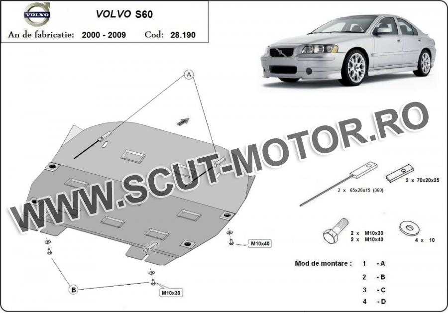 Scutul este noua si se potriveste perfect pentru toate tipurile de motorizare Volvo S60 fabricat între ani 2000 - 2009. Scutul protejeazã: motor, cutie de viteză, radiator.