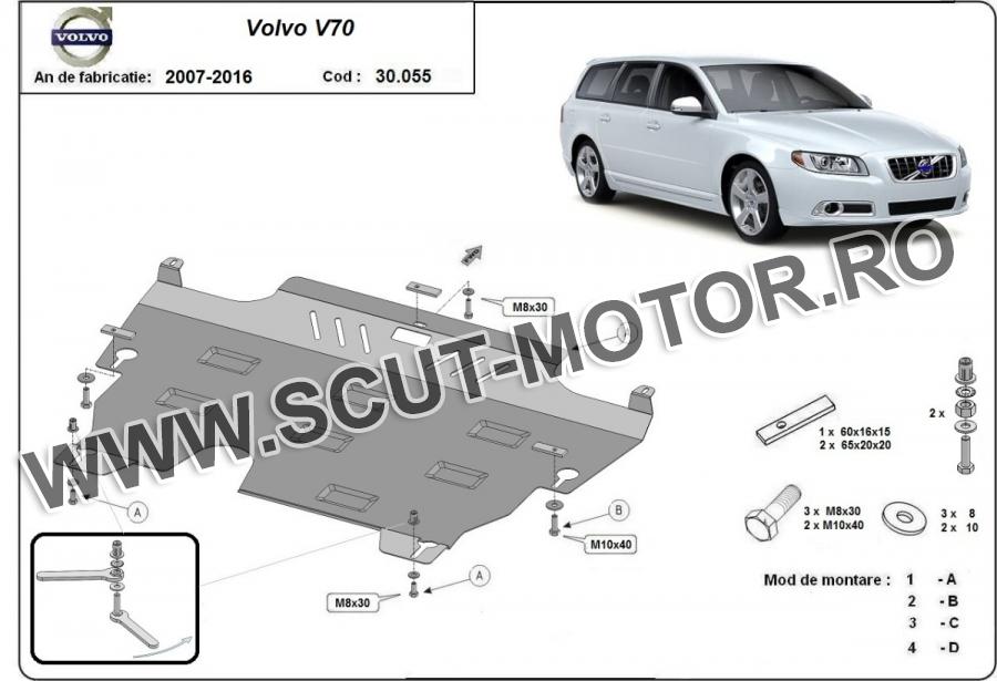 Scutul este noua si se potriveste perfect pentru toate tipurile de motorizare Volvo V70 fabricat între ani 2007 - 2016. Scutul protejeazã: motor, cutie de viteză, radiator.