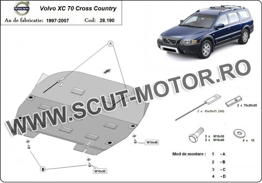 Scutul este noua si se potriveste perfect pentru toate tipurile de motorizare Volvo XC70 fabricat între ani 1997 - 2007. Scutul protejeazã: motor, cutie de viteză, radiator.
