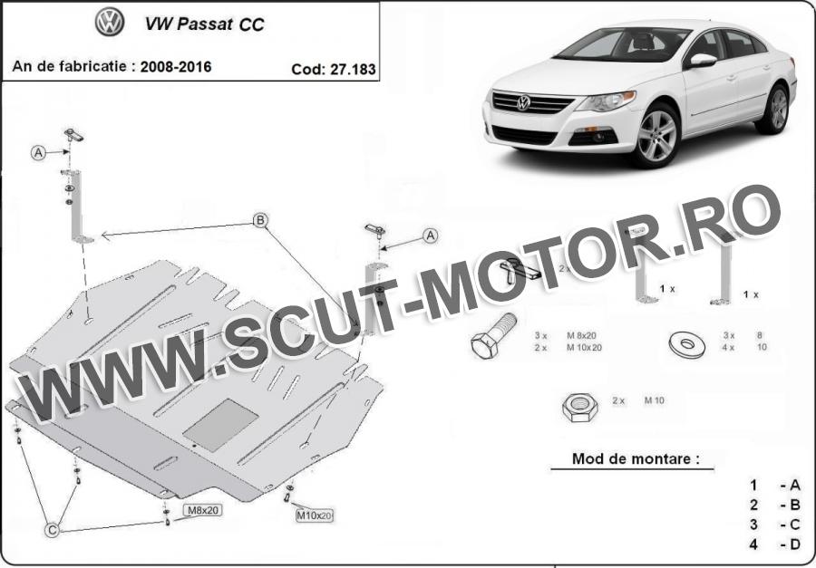 Scutul este noua si se potriveste perfect pentru tipurile de motorizare 2.0 TFSI quattro,2.0,Tdi, - VW Passat CC fabricat între ani 2008 - 2016. Scutul protejeazã: motor, cutie de viteză, radiator, bara față.