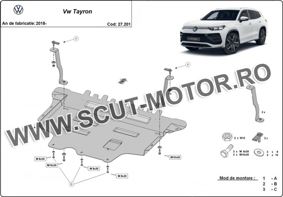 Scutul este noua si se potriveste perfect pentru toate tipurile de motorizare VW Tayron fabricat între ani 2018 - 2026. Scutul protejeazã: motor, cutie de viteză, radiator.