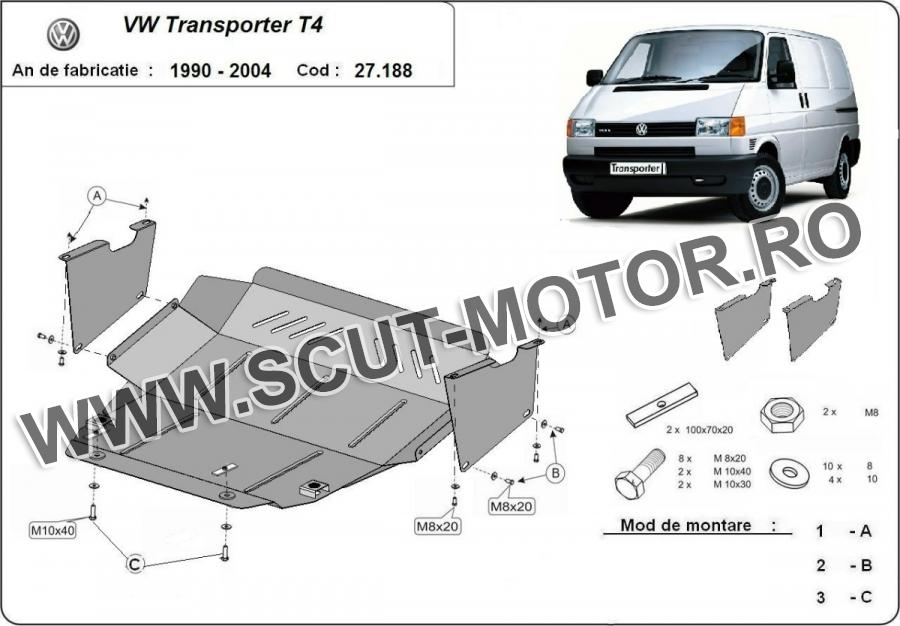 Scutul este noua si se potriveste perfect pentru toate tipurile de motorizare VW Transporter T4 Caravelle fabricat între ani 1990 - 2003. Scutul protejeazã: motor, cutie de viteză.