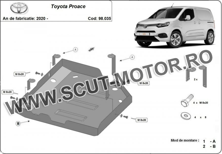 Scutul este noua si se potriveste perfect pentru toate tipurile de motorizare Toyota Proace fabricat între ani 2020 - 2026. Scutul protejeazã: rezervor AdBlue.