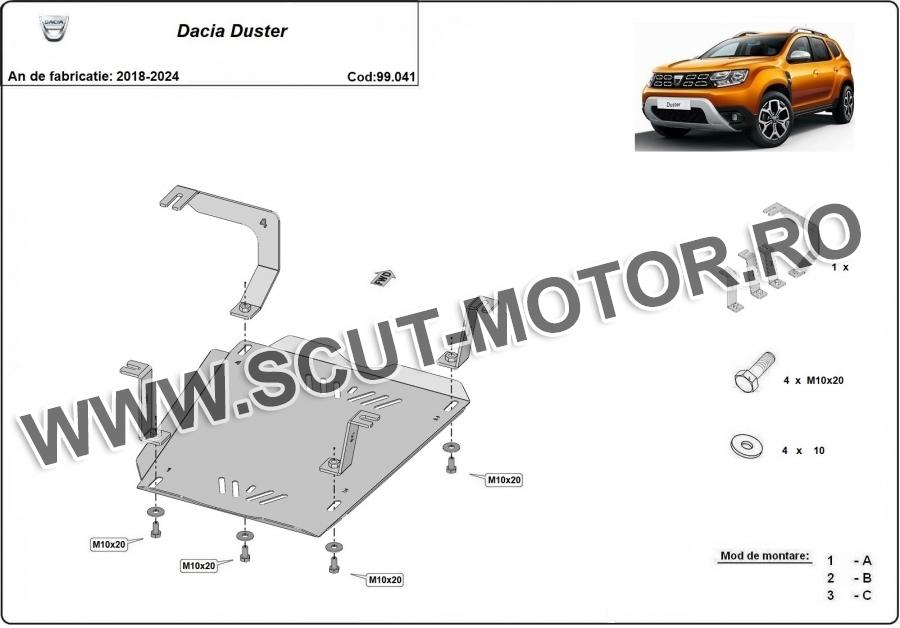 Scutul este noua si se potriveste perfect pentru tipurile de motorizare 4x4 - Dacia Duster fabricat între ani 2018 - 2024. Scutul protejeazã: rezervor.