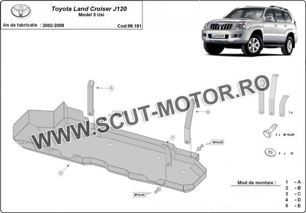 Scutul este noua si se potriveste perfect pentru toate tipurile de motorizare Toyota Land Cruiser J120 fabricat între ani 2002 - 2009. Scutul protejeazã: rezervor.